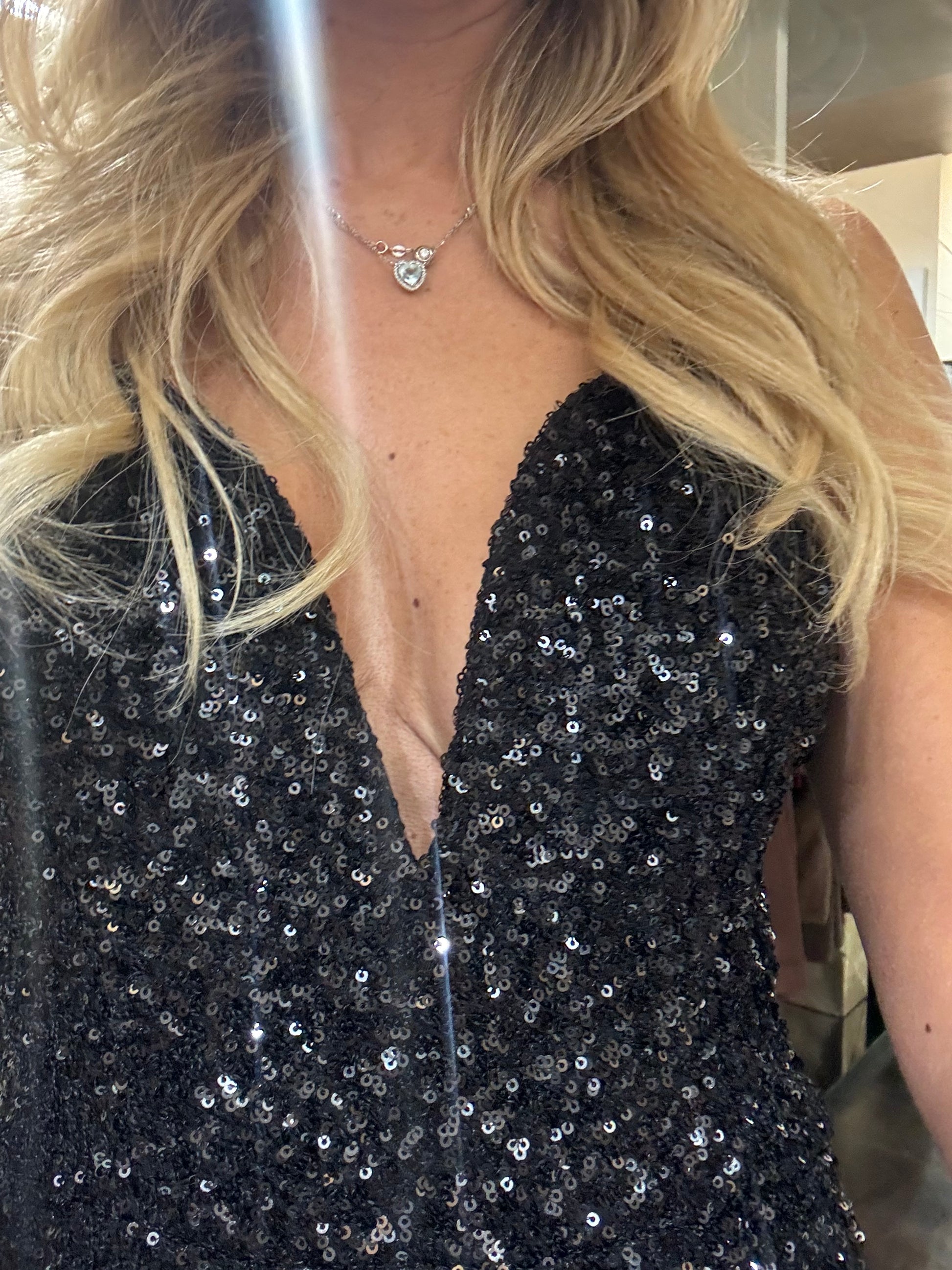 Abito lungo in paillettes e con spalline. Scollo a cuore profondo con leggera imbottitura e spacco laterale.