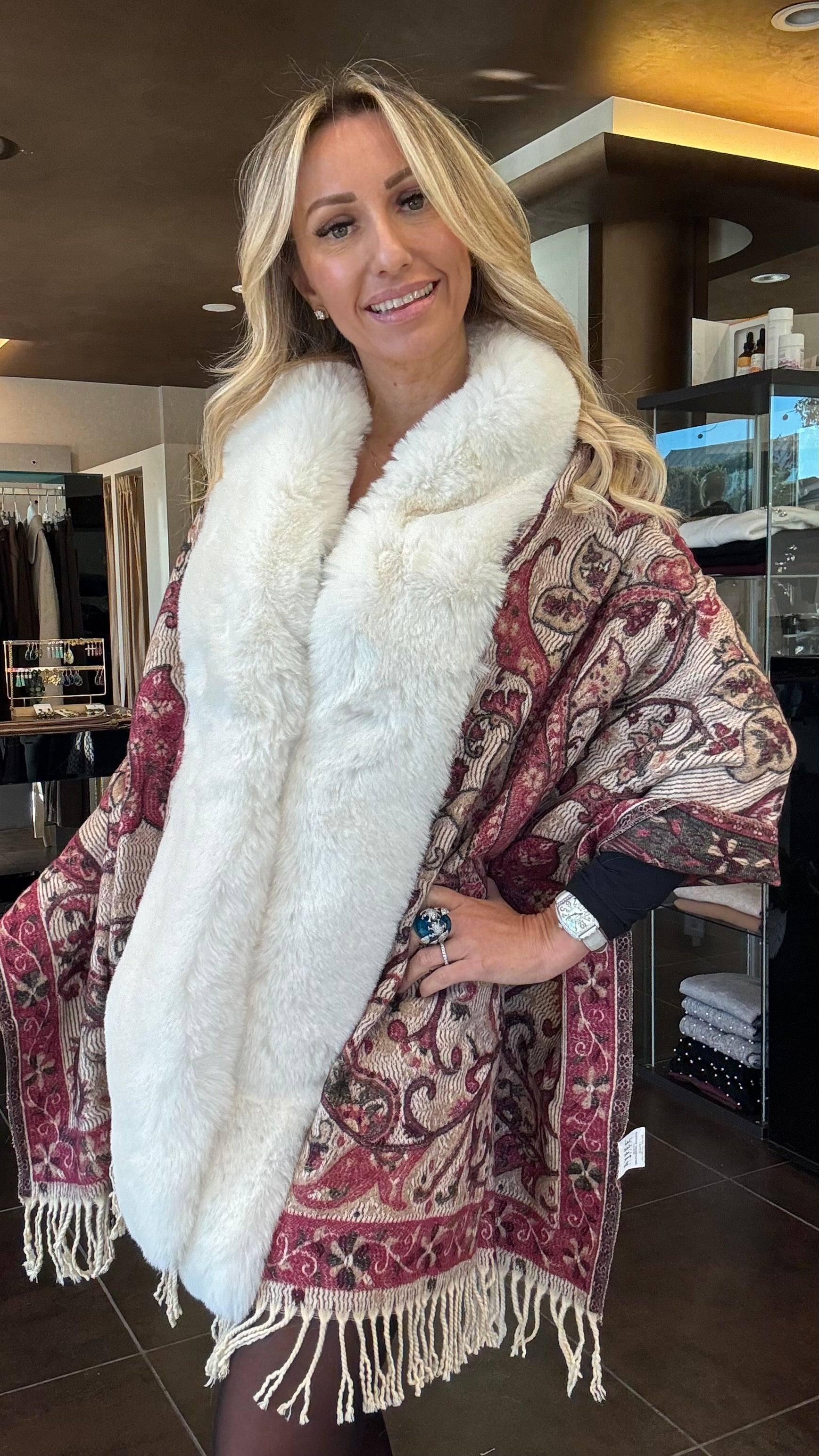 Mantella a fantasia floreale con pelo nella parte anteriore e frange nella parte bassa. Adatta per essere indossata sia da sola che sopra altri capispalla. Taglia unica.