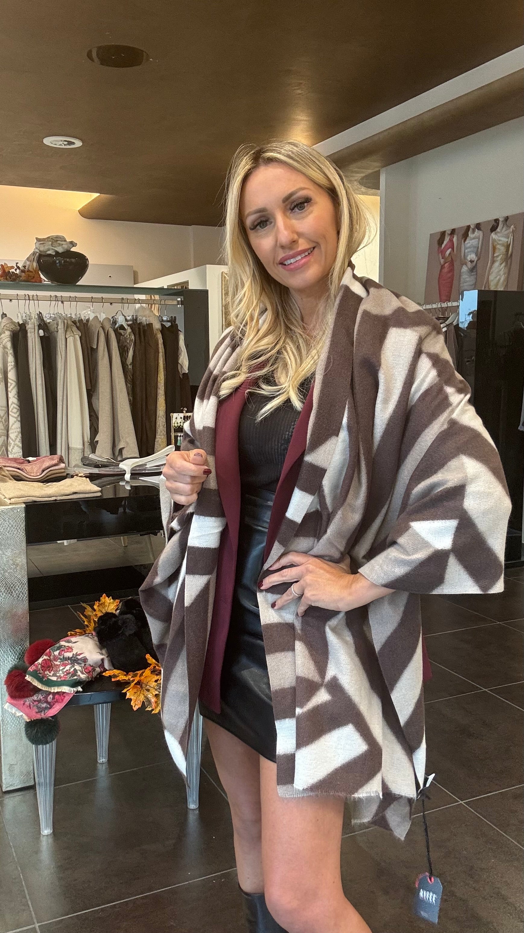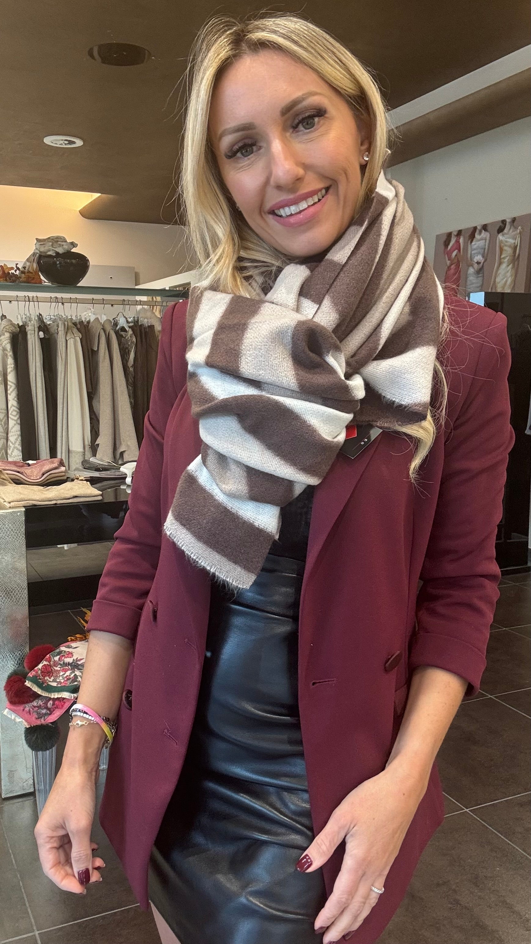Stola con fantasia rigata utilizzabile sia come sciarpa che come capospalla/mantellina da indossare sopra le giacche.