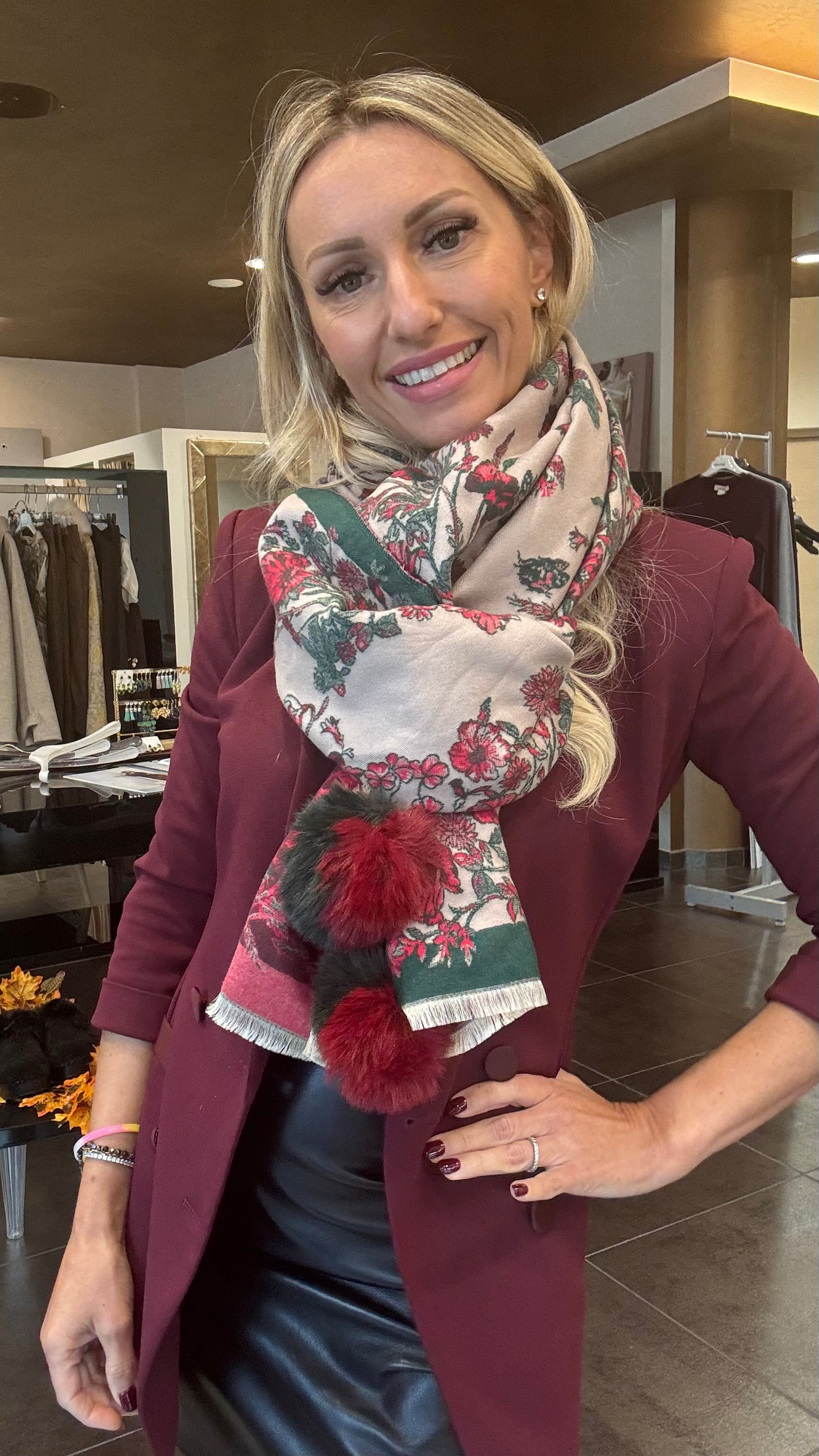 Stola con ricami floreali e pon pon adatta sia come sciarpa che come mantellina sopra le giacche.