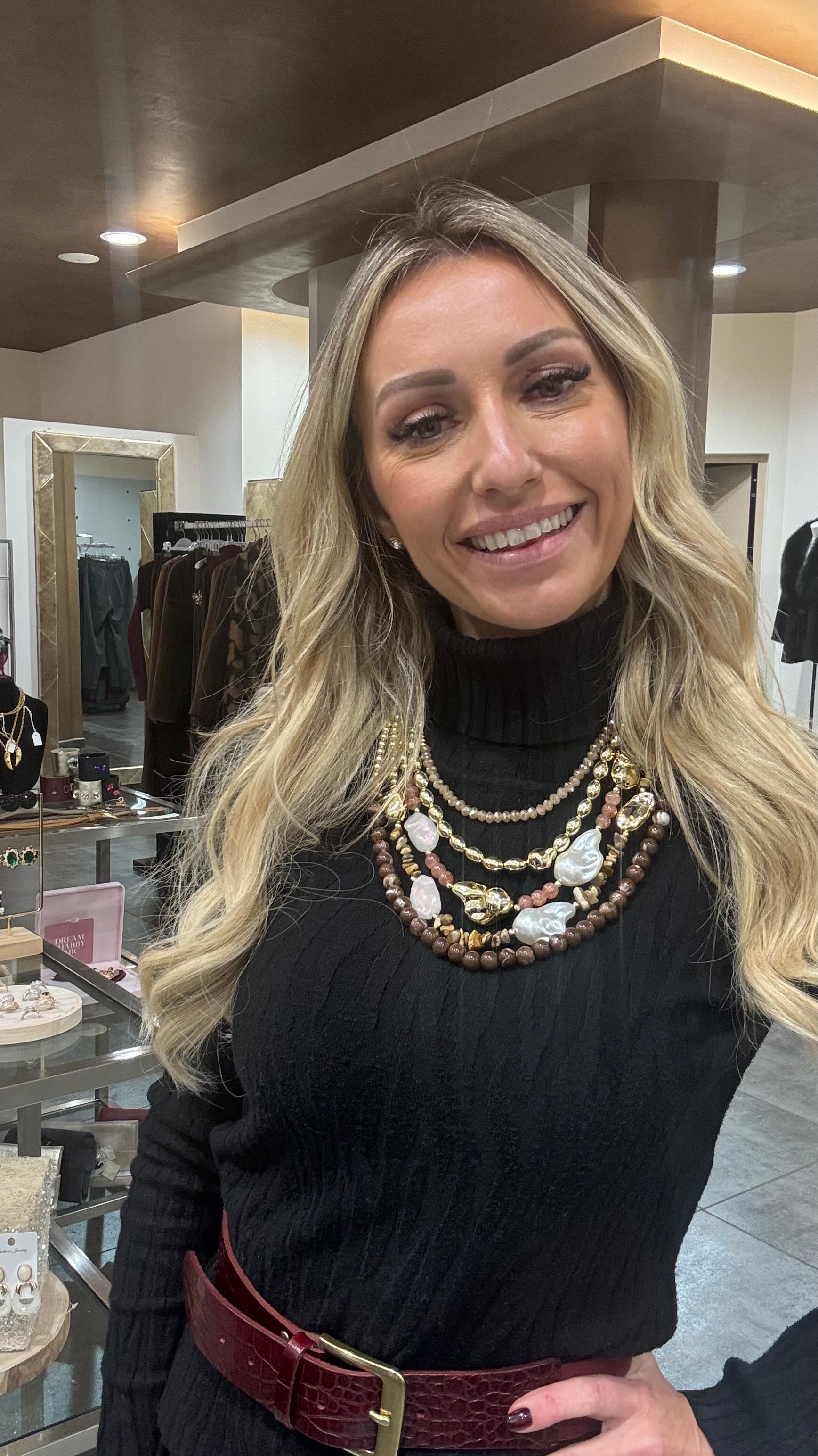 Collana a 5 fili degrade base oro con pietrein resina bianco, marrine, rosa cipria