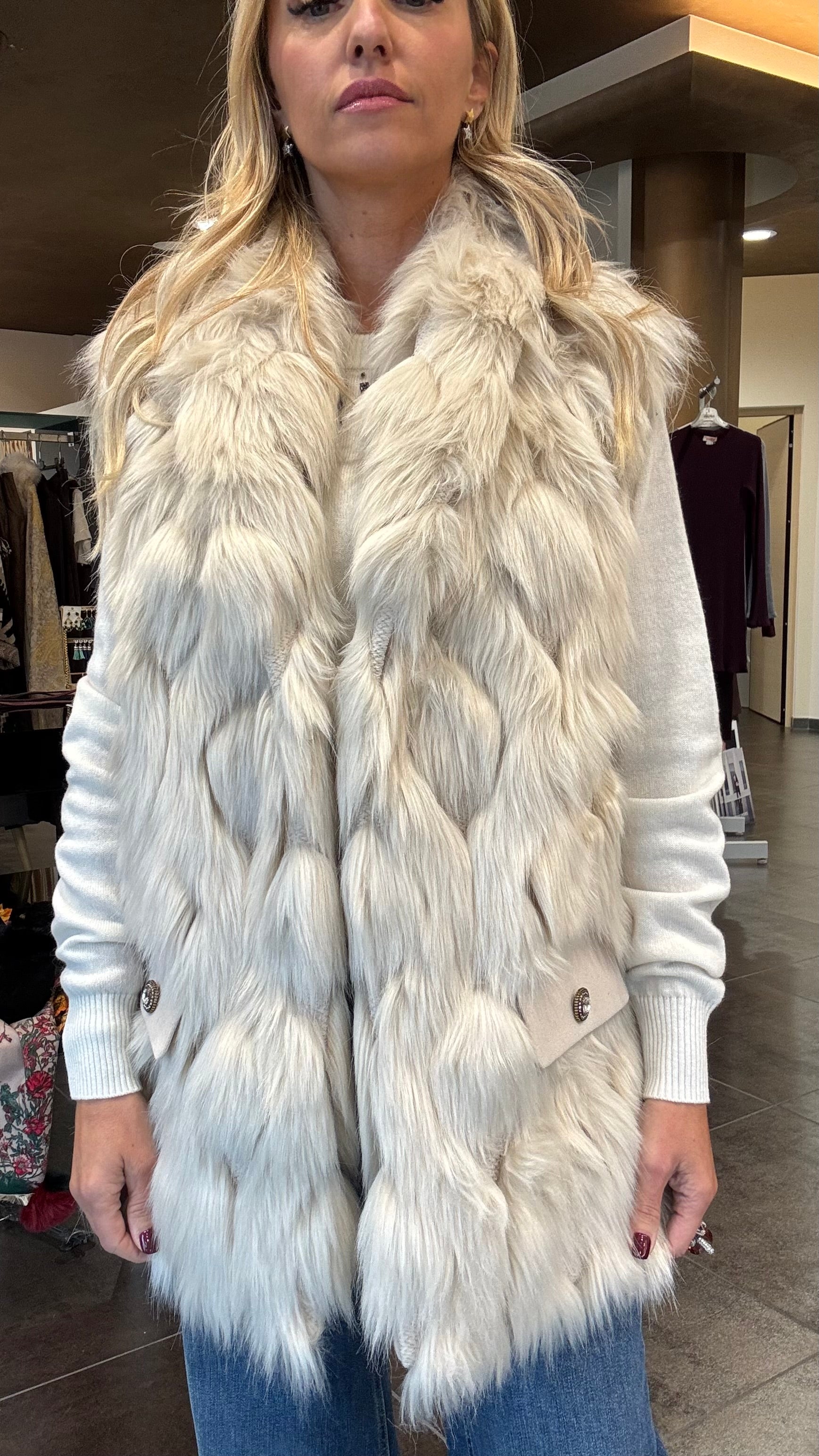 Gilet panna con pelo ecologico e tasche applicate con dettaglio gioiello nella parte anteriore. Parte posteriore in panno. Adatto anche per essere indossato sopra giacche e cappotti. Calza come se fosse una taglia unica.