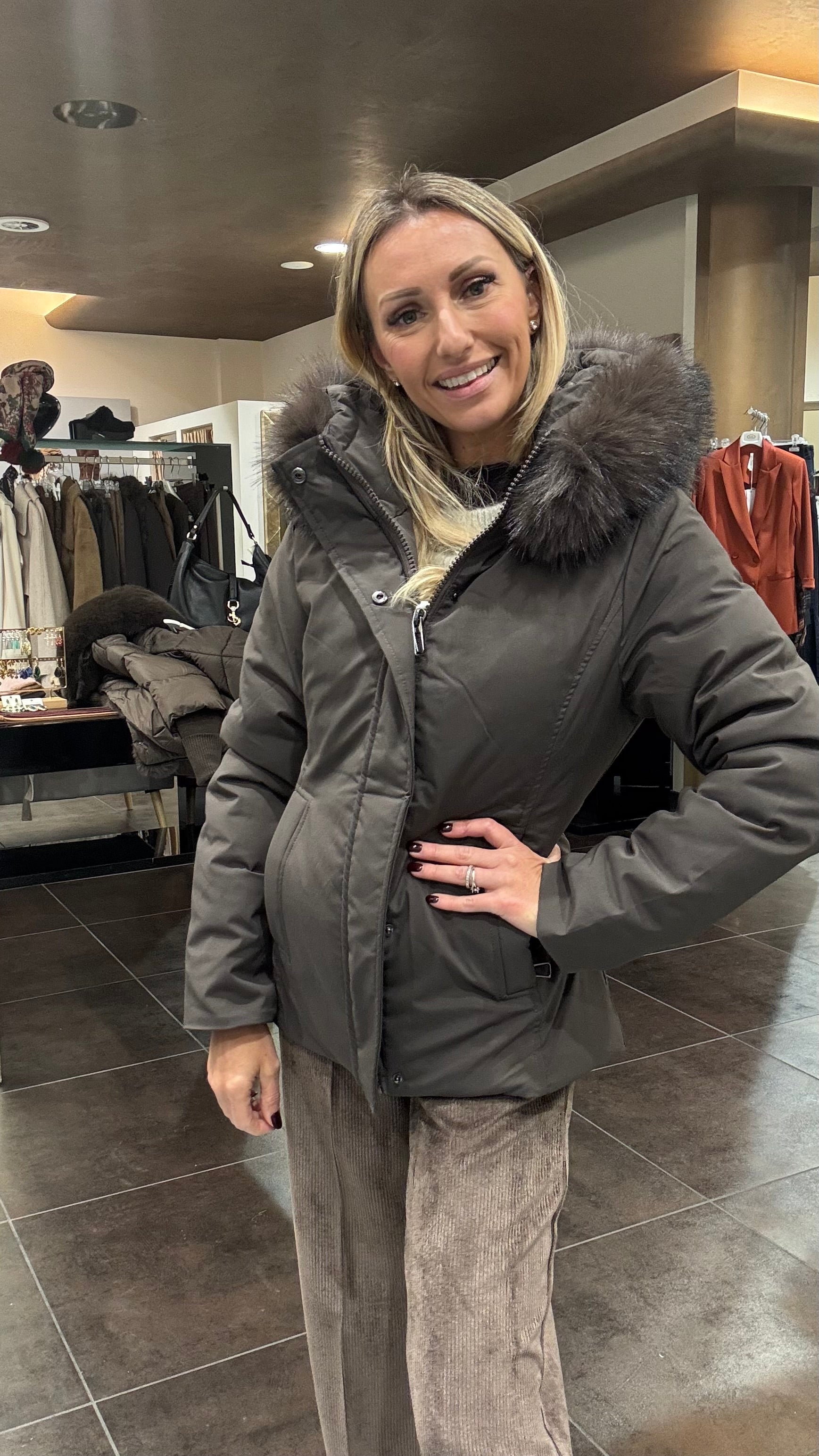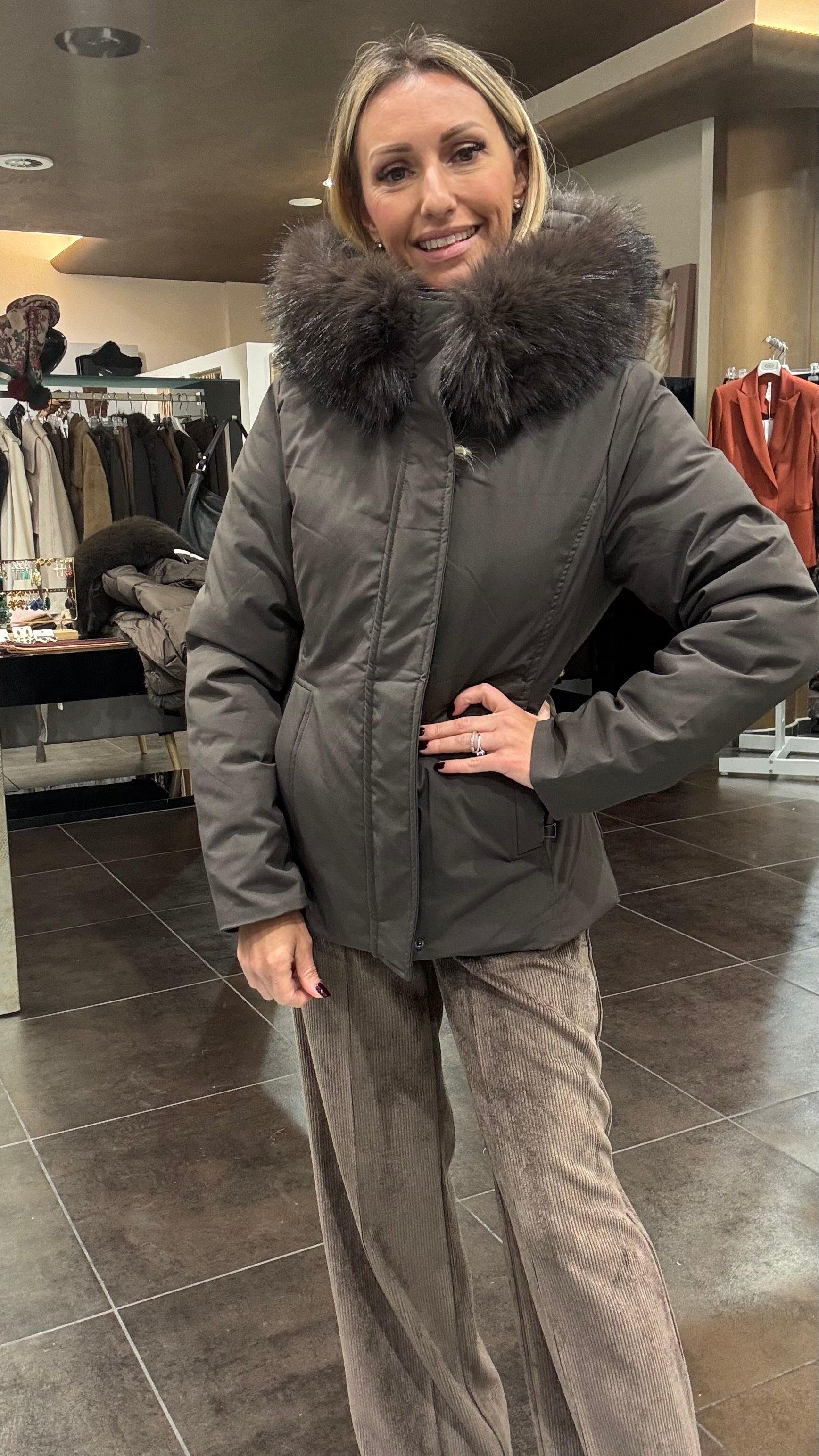 Giaccone imbottito in tessuto tecnico con collo in pello ecologico staccabile, cappuccio, zip e bottoni automatic