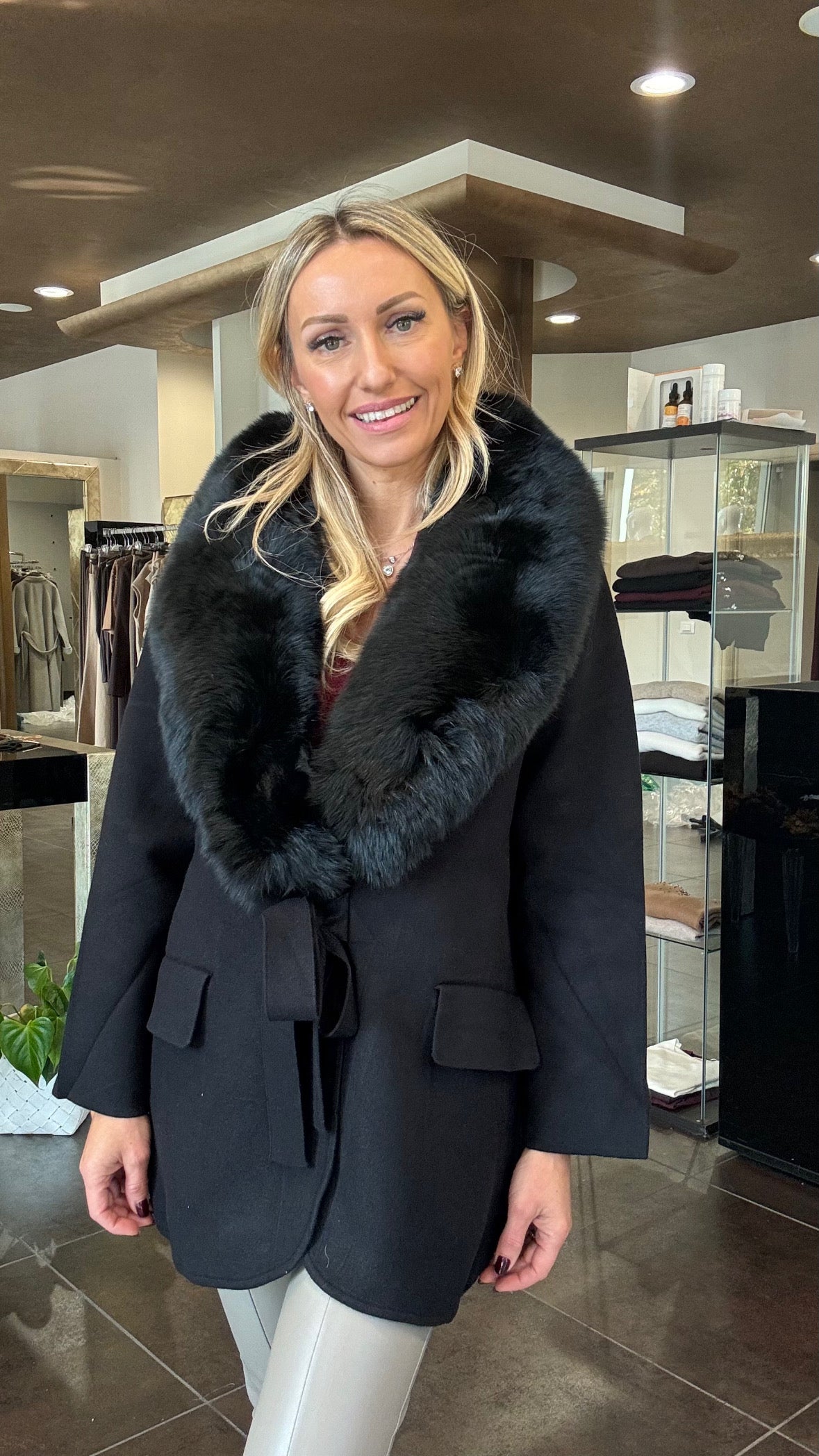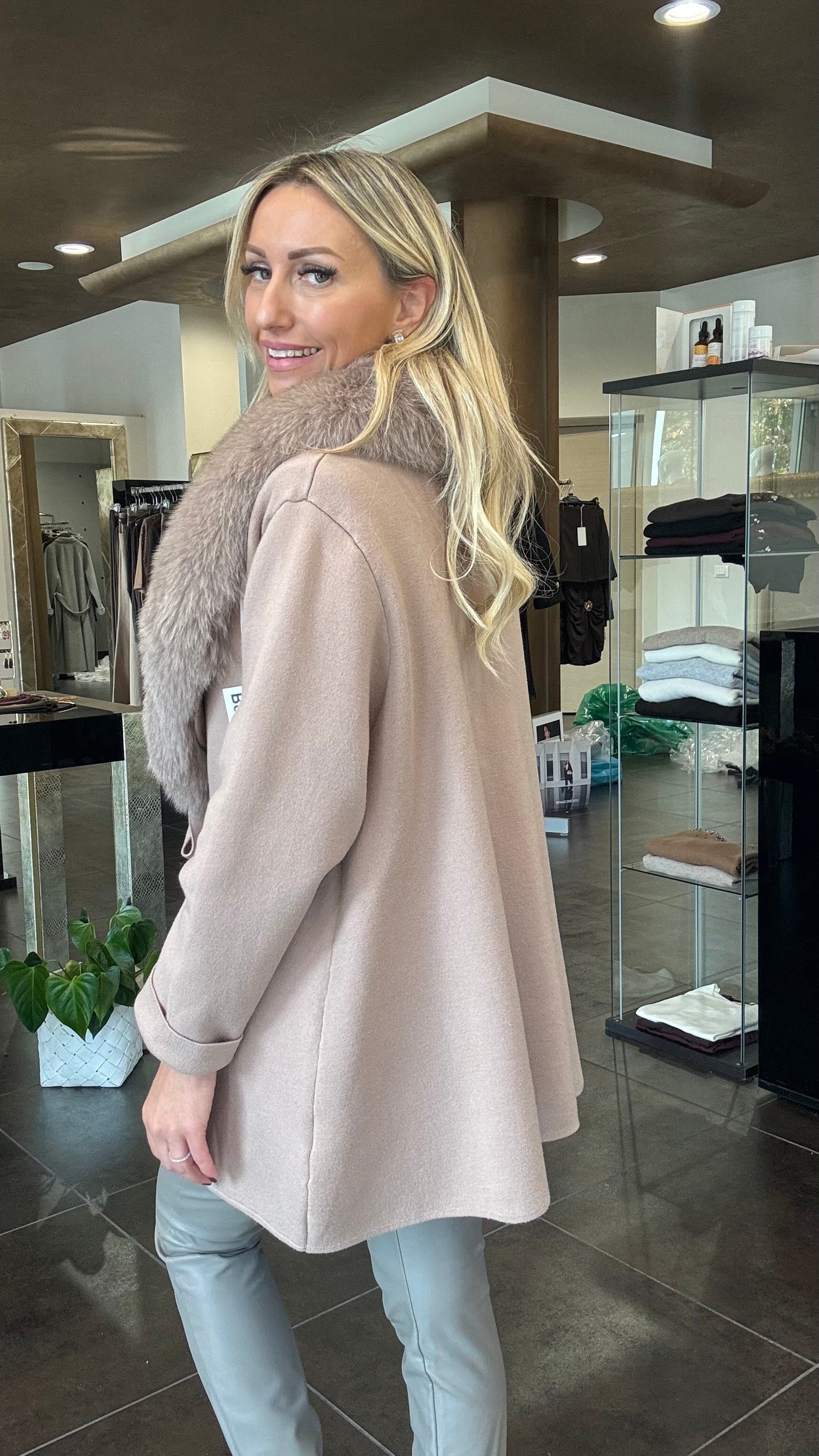 Giaccone corto in maglia svasato effetto a mantella con collo in ecovolpe rimovibile, bottone automatico centrale e nastro in vita. Veste come una taglia unica