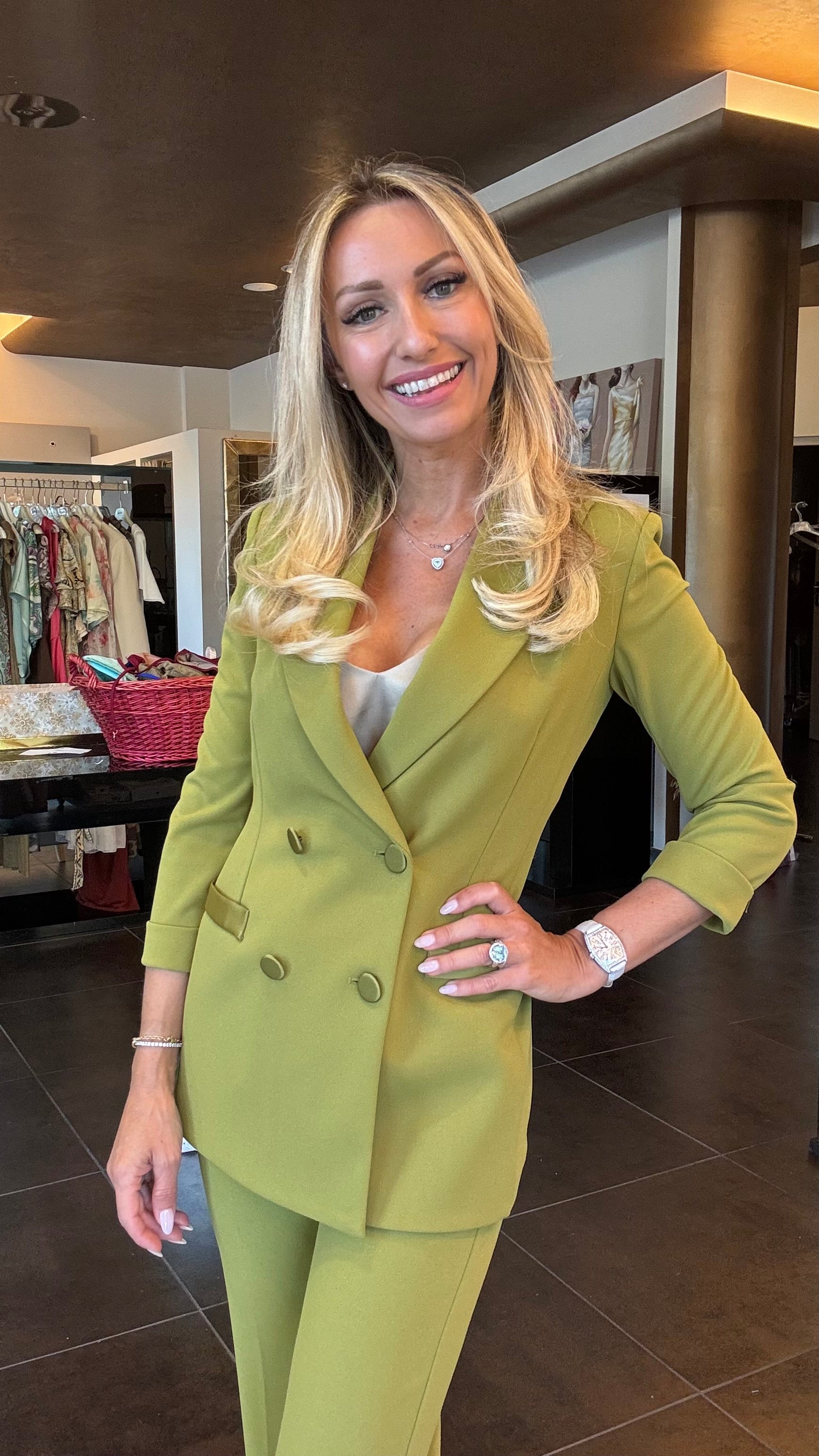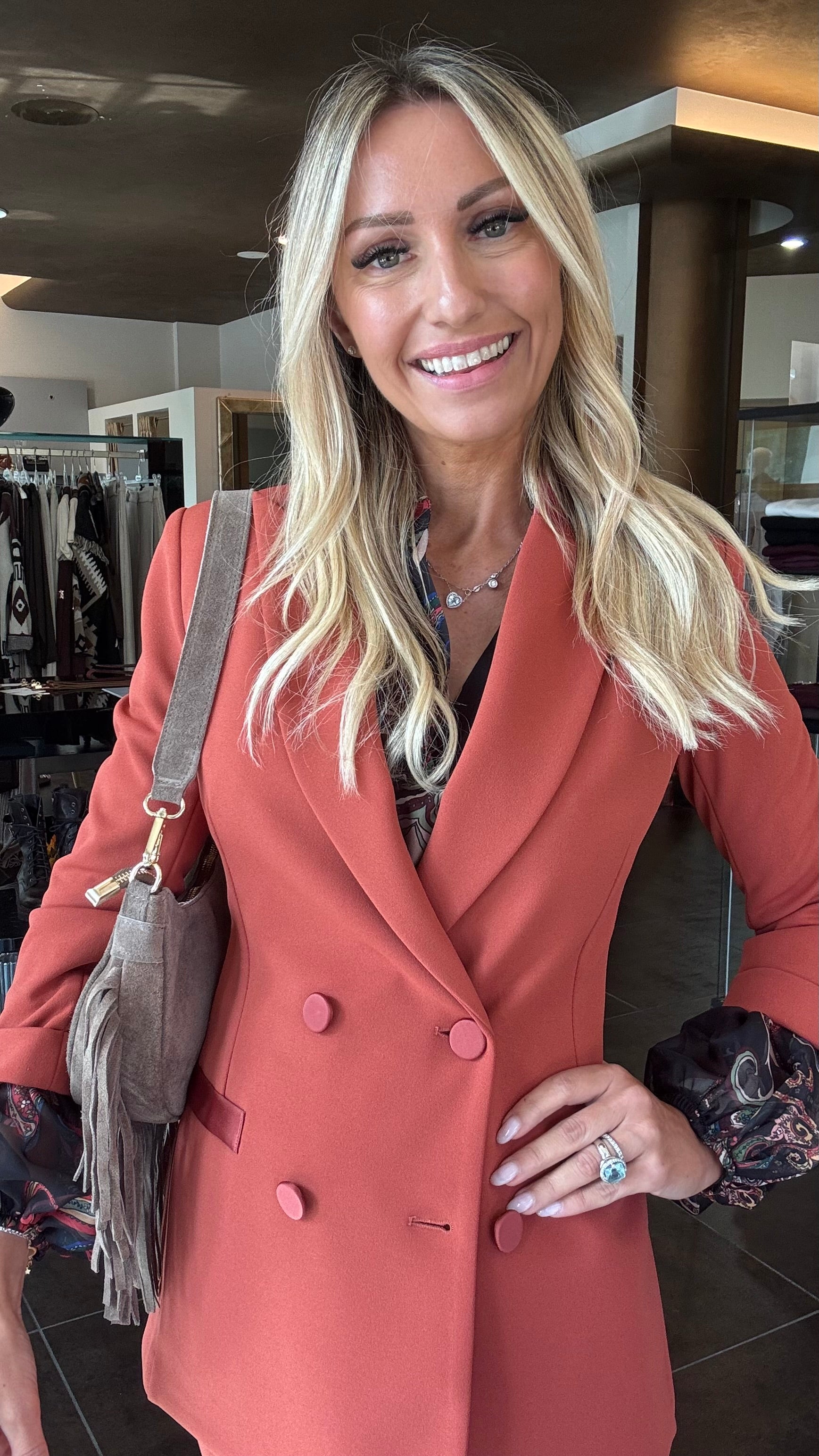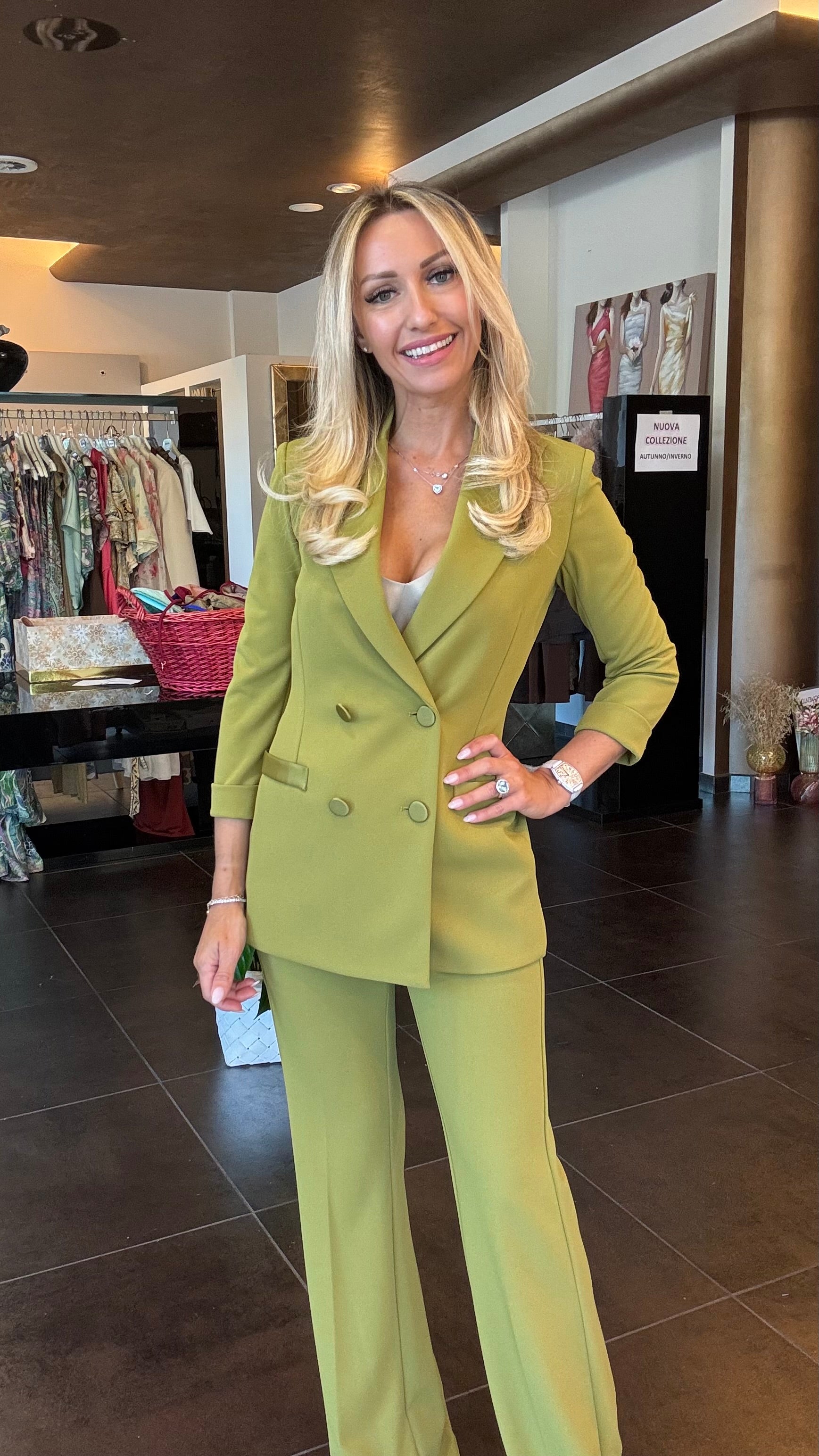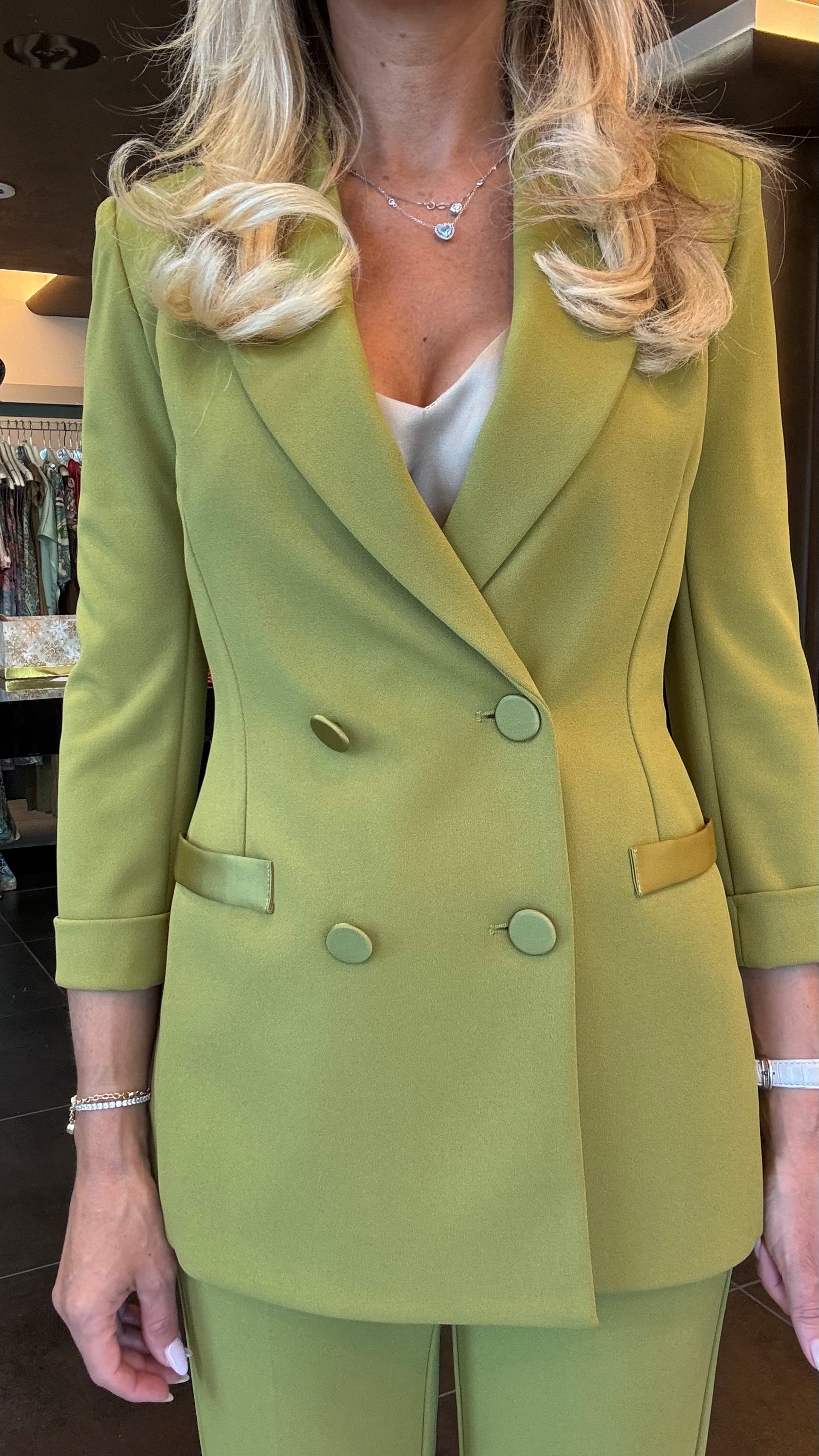Giacca in screppino doppio petto, bottoni ,bordo tasca a filetto e parte alta del collo in raso, manica a tre quarti.