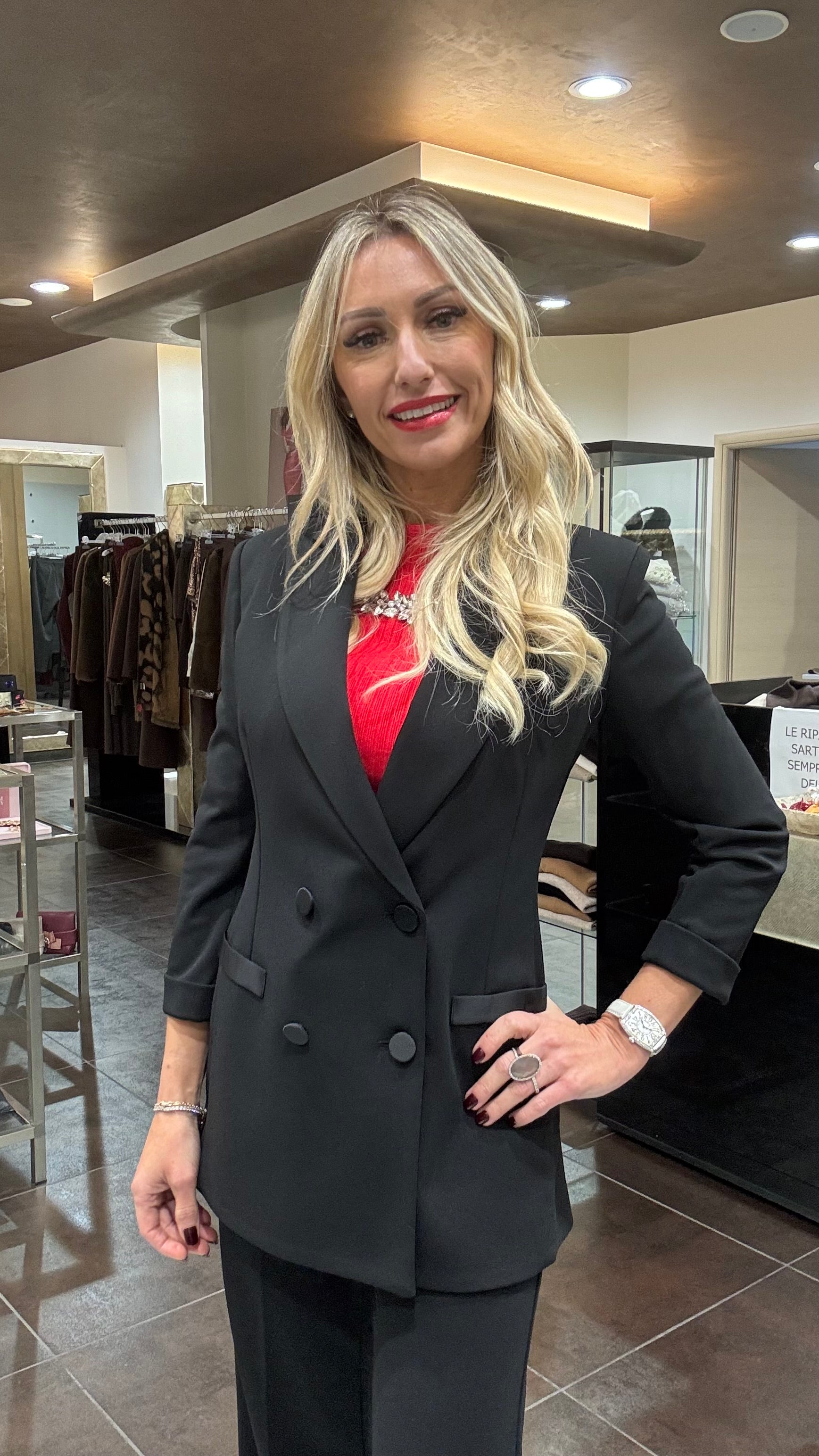 Giacca in screppino doppio petto, bottoni ,bordo tasca a filetto e parte alta del collo in raso, manica a tre quarti.