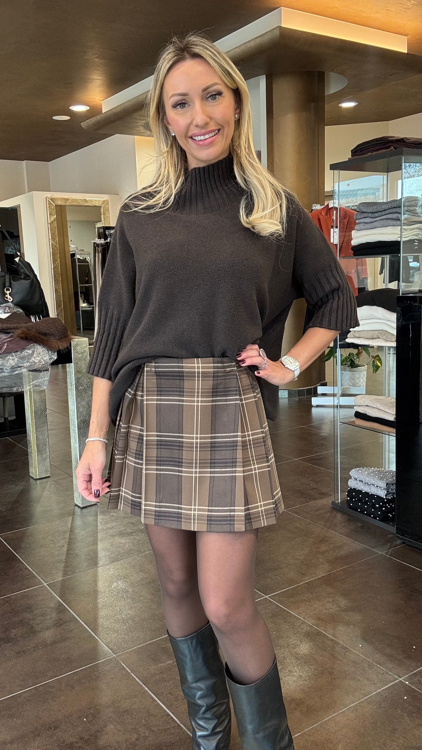 Gonna a pieghe con chiusura a portafoglio con bottoni automatici fantasia check