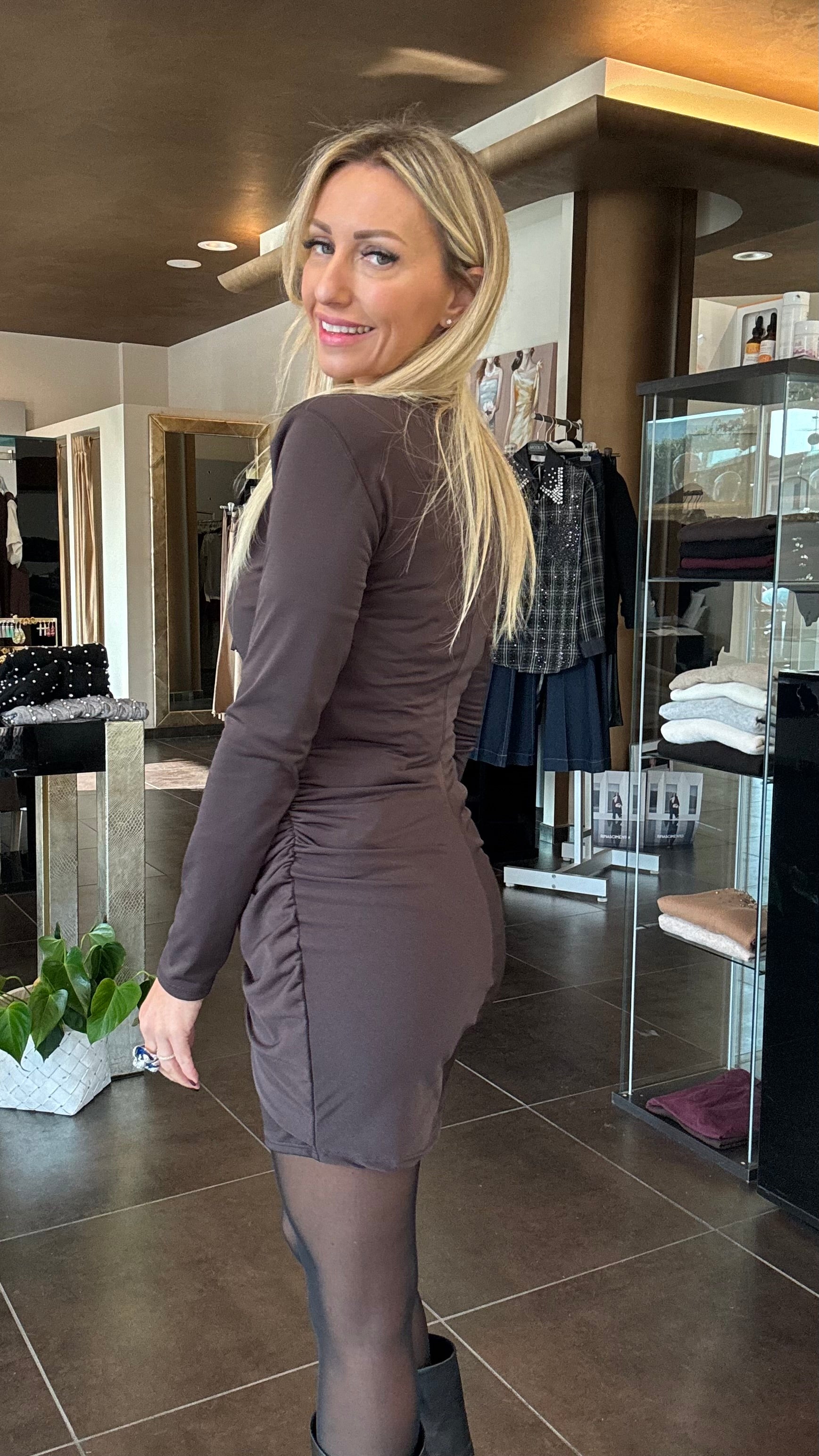 Abito corto a maniche lunghe con dettaglio oro in vita e arricciature. Taglia unica.