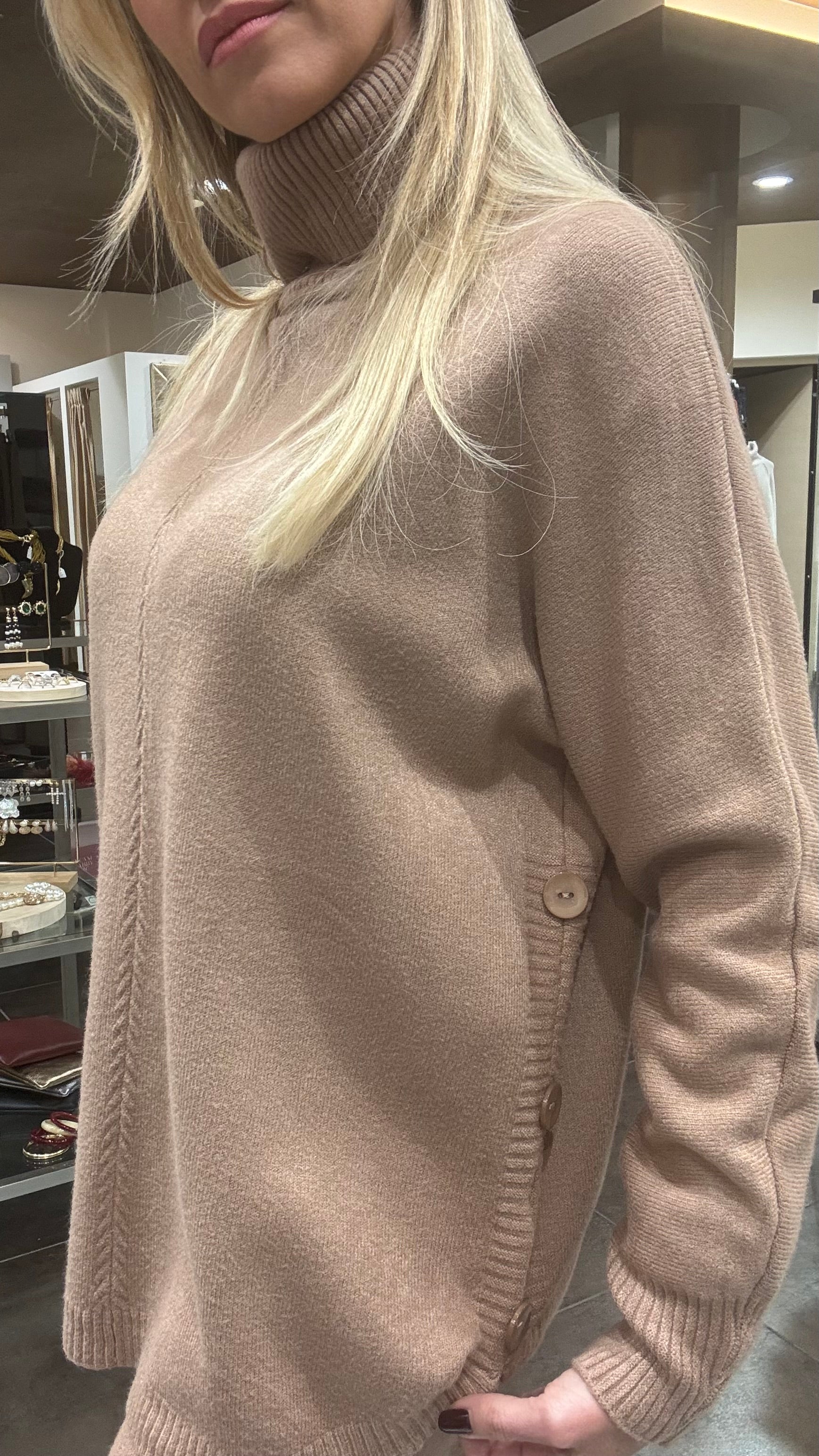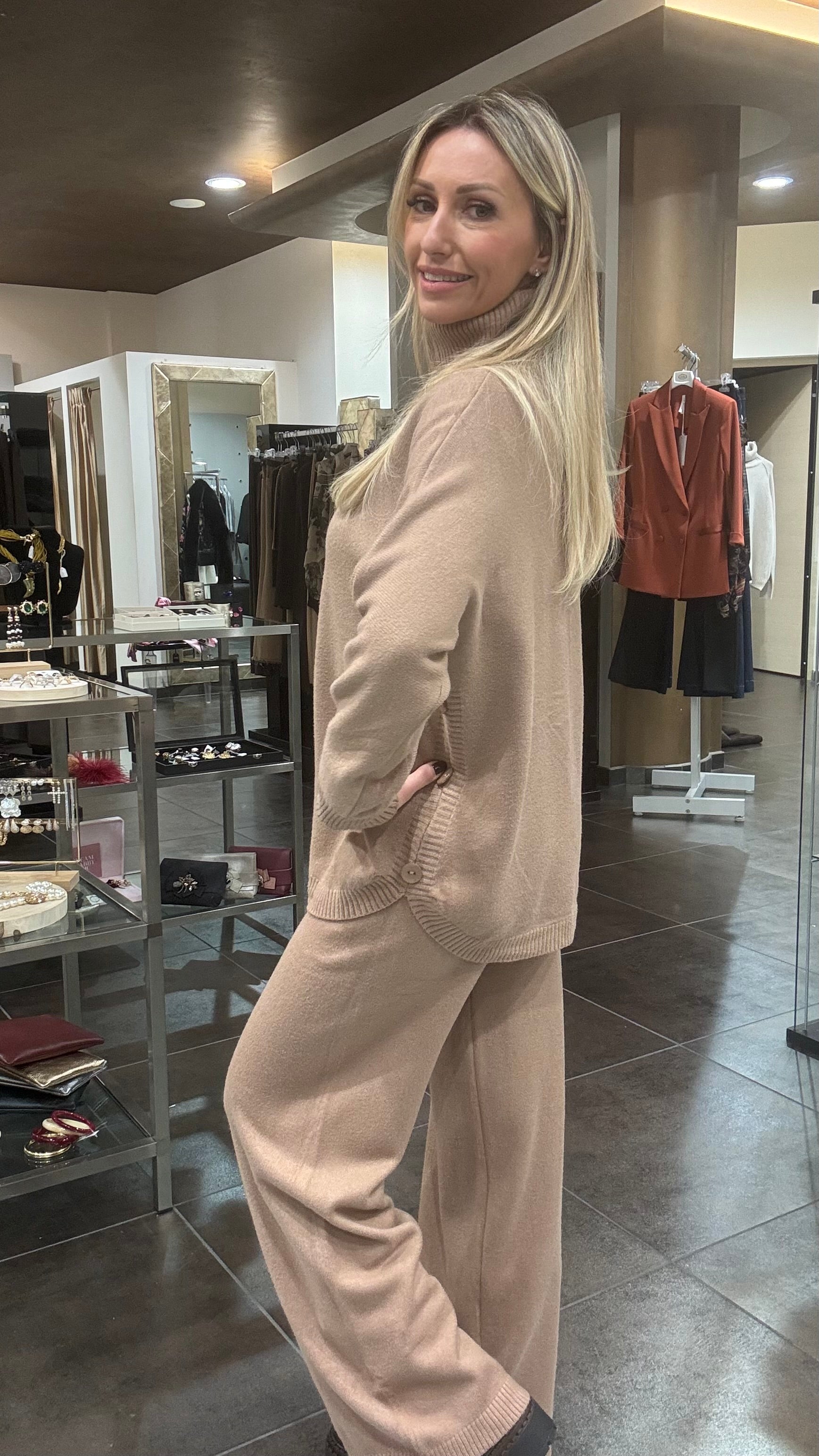 Maglia con collo alto e bottoni laterali e pantalone a palazzo abbinato. Set coordinato. Taglia unica