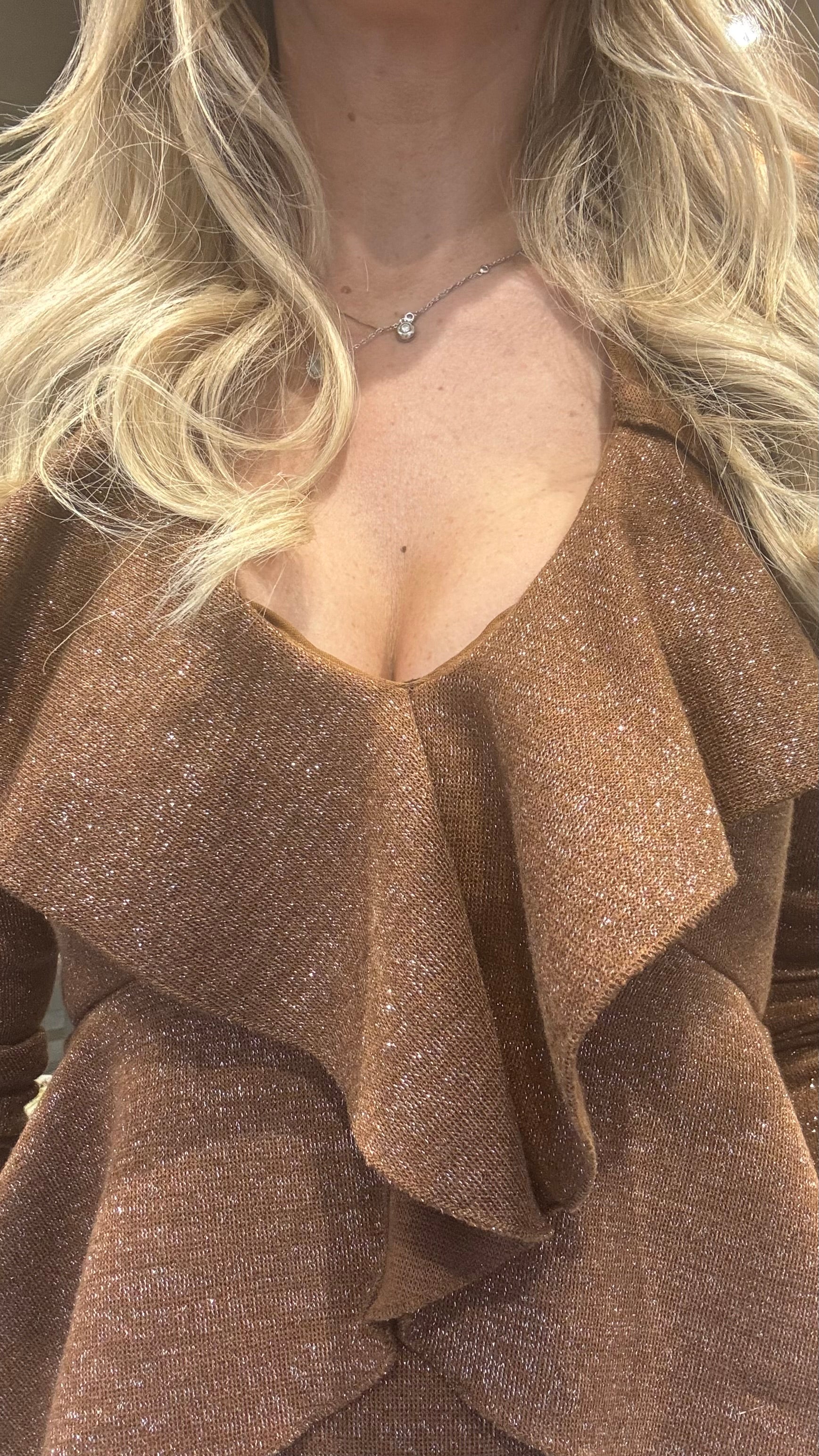 Abito corto maniche lunghe con volant sulla parte anteriore. Elasticizzato e con fodera interna.