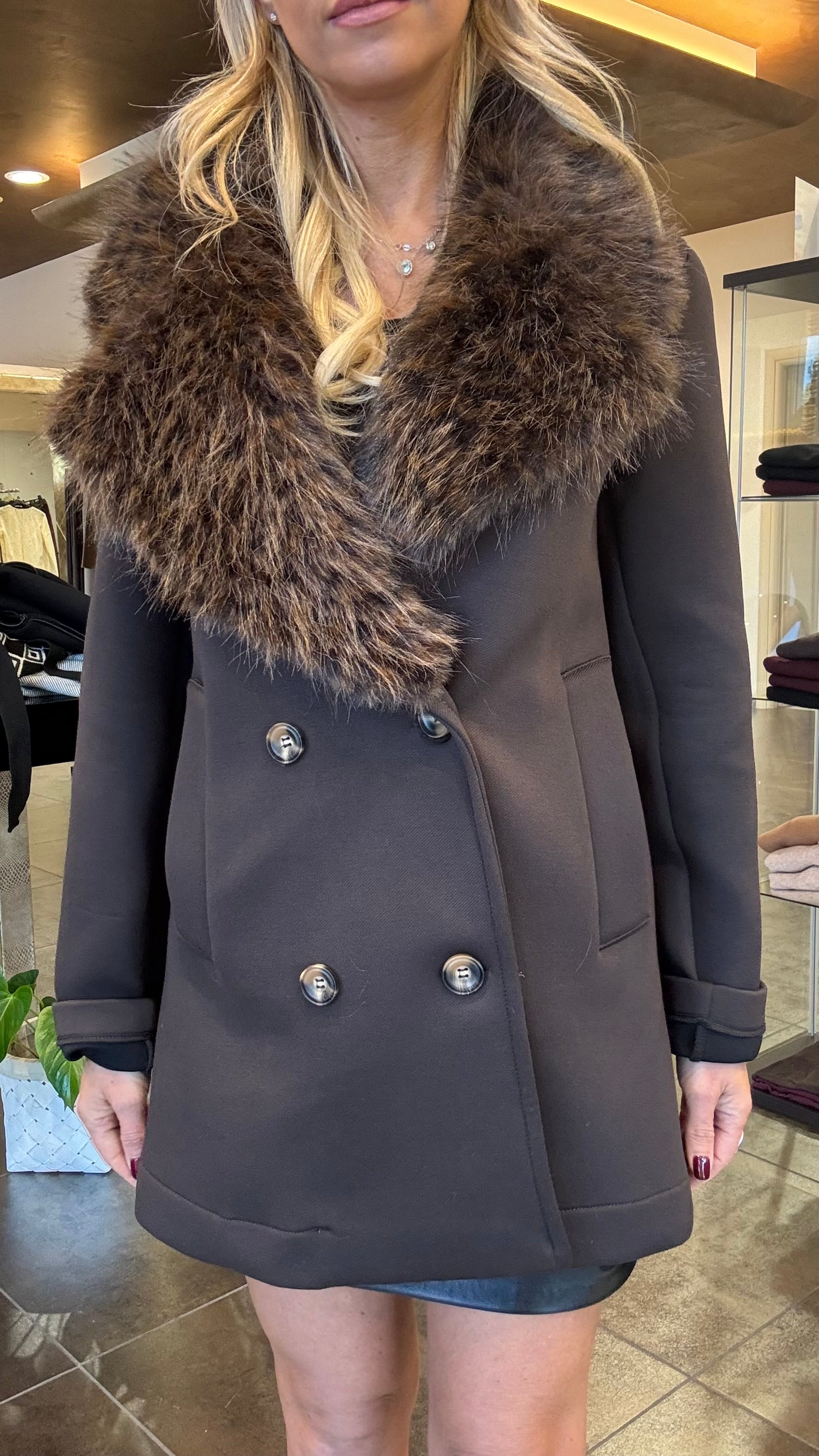 Cappottino in neoprene svasato con bottoni e collo in ecopelo