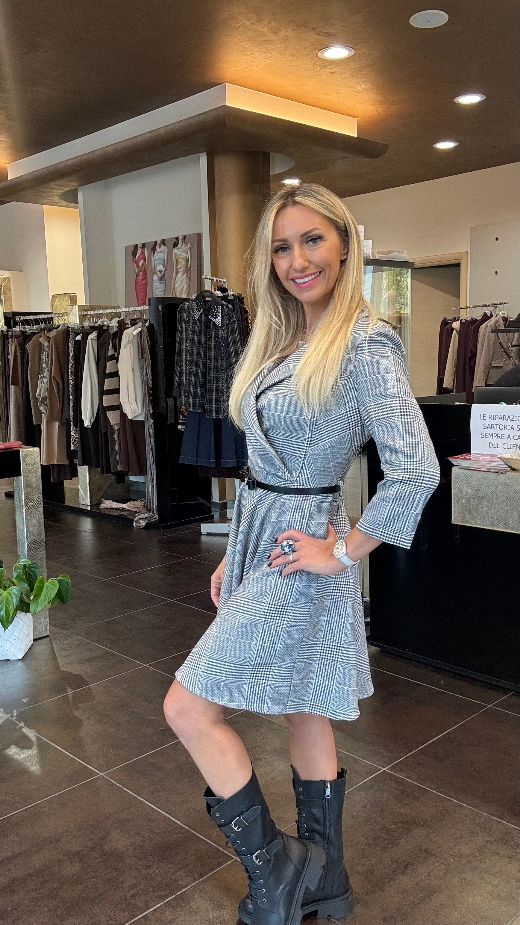 Abito scollo a giacca, gonna svasat, cinturina in vita, zip laterale