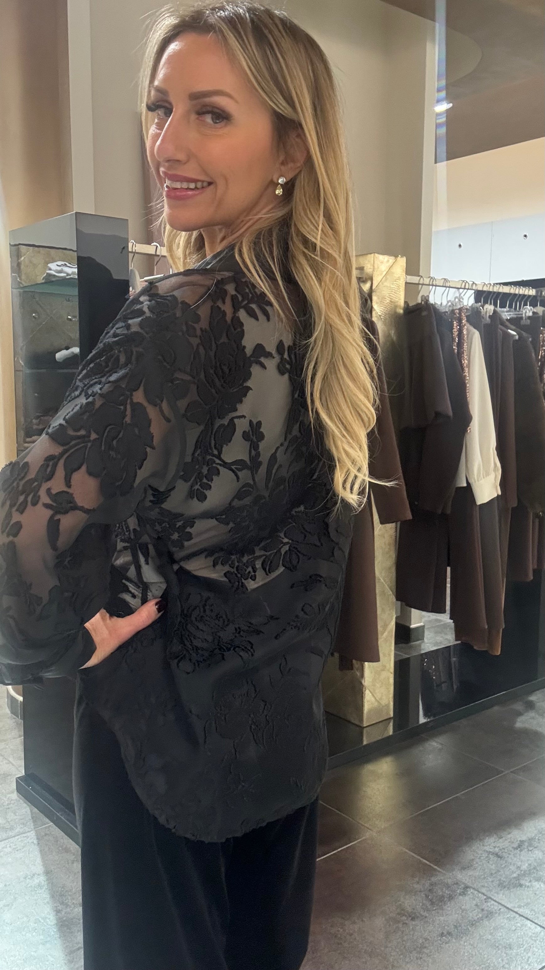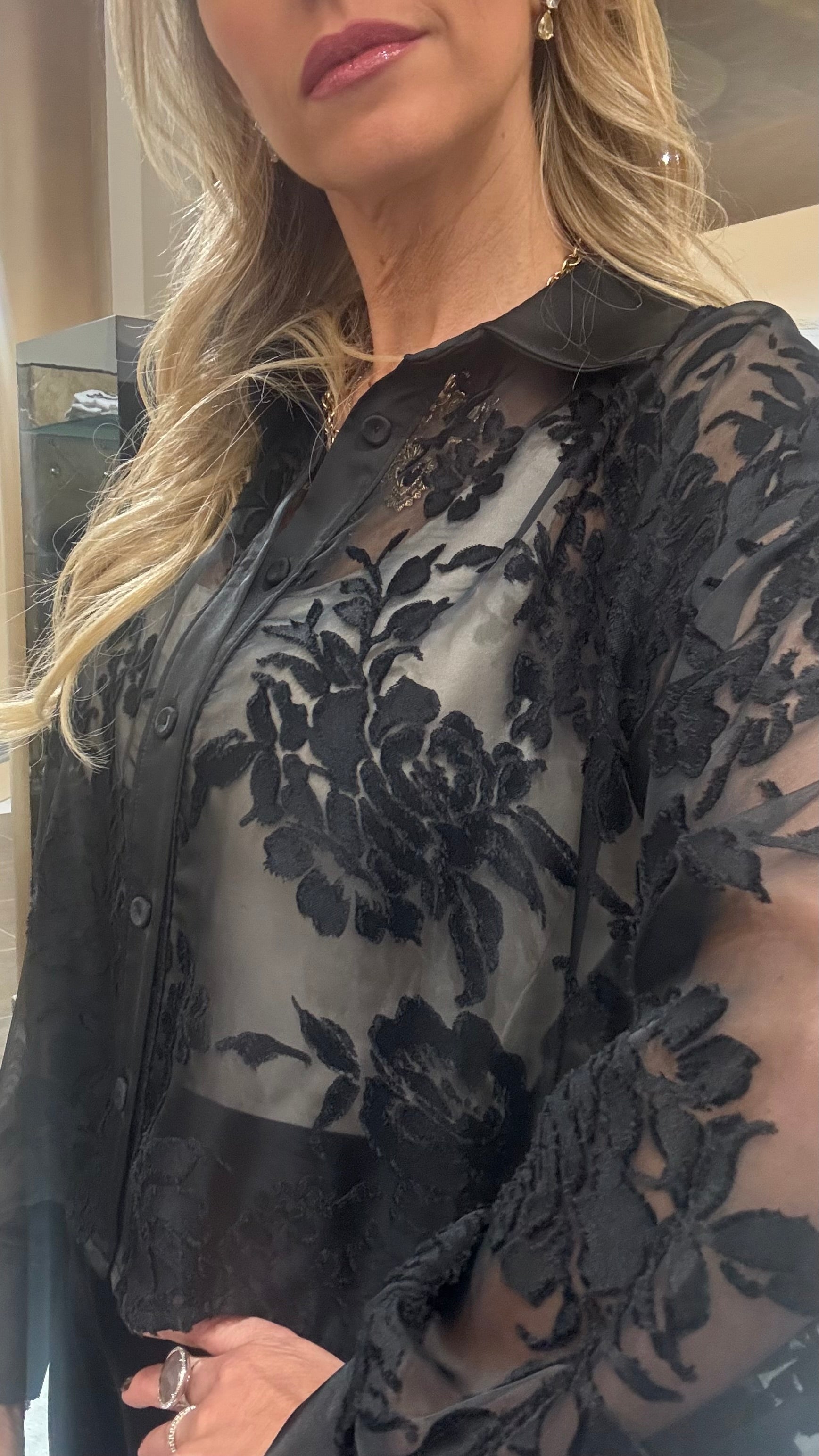 Camicia nera garzata con ricamo fiore in velluto. Collo, polsi e bottoni in raso, più corta sul davanti. Perfetta con panatloni a palazzo.