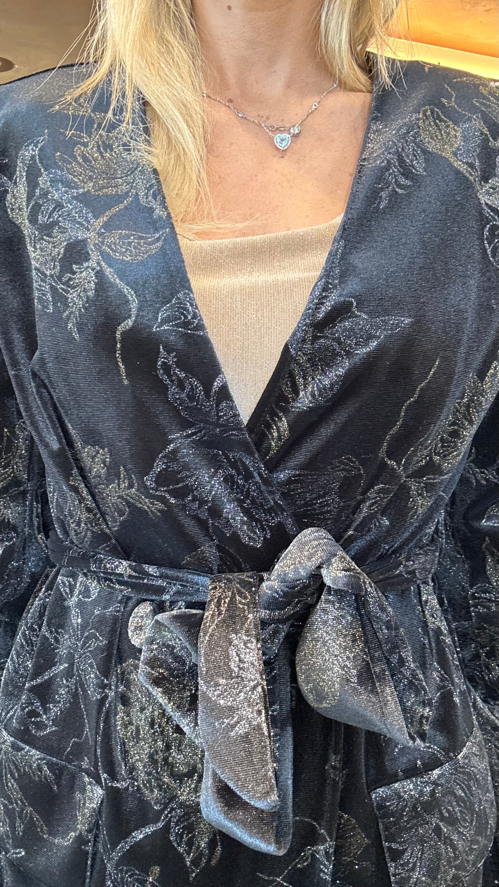 Giacca kimono con spalline in velluto con stampa rose glitter e cintura in vita
